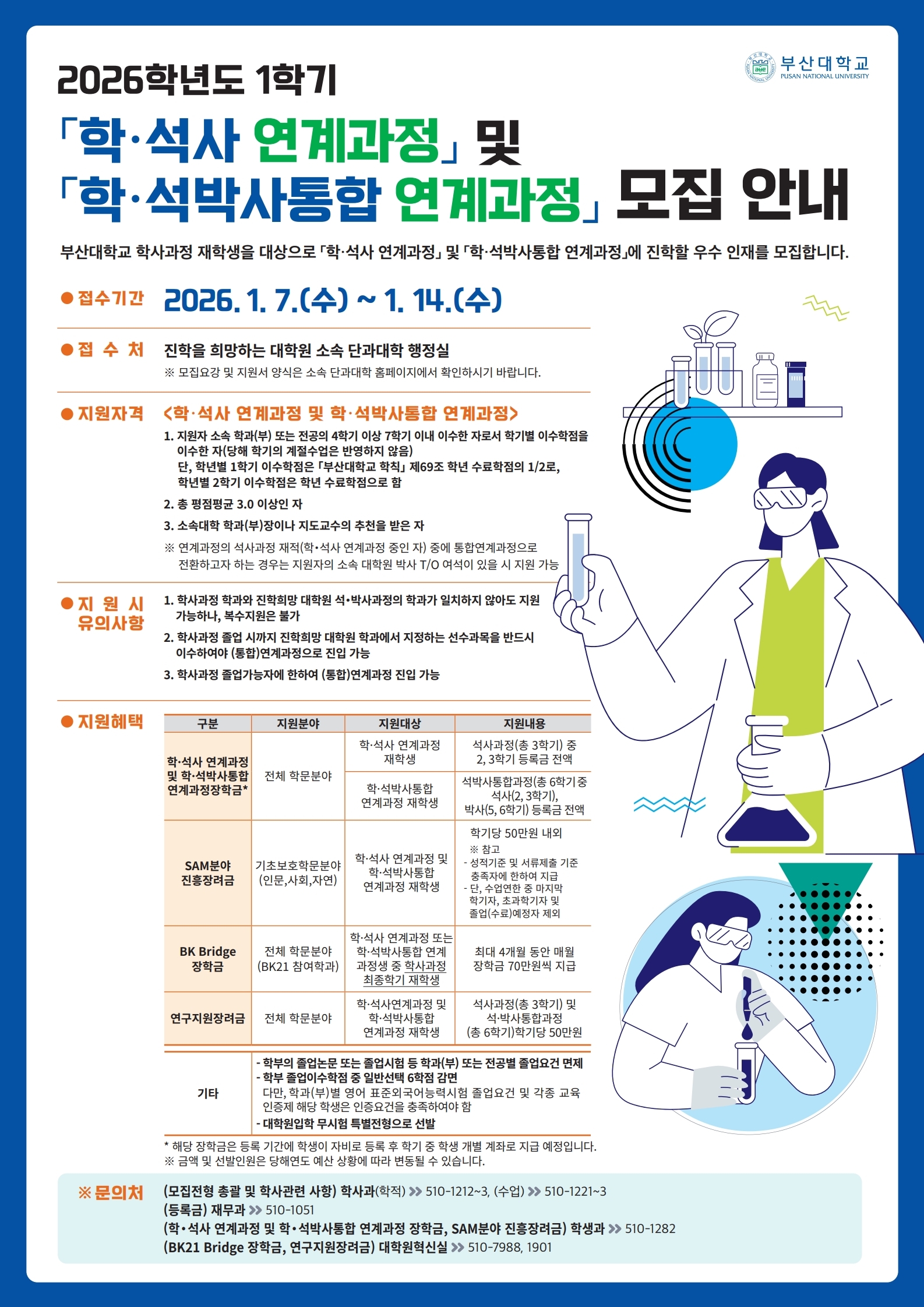 fnctId=bbs,fnctNo=2650 작성일 2025.12.30 수정일 2025.12.30 작성자 신효재 조회수 28 2026학년도 1학기 학.석(박)사 통합 연계과정 모집 안내 2026학년도 1학기 학.석(박)사 통합 연계과정 모집 안내 관련 게시글 2026학년도 1학기 학.석(박)사 통합 연계과정 모집 안내 첨부파일 첨부파일이(가) 없습니다.